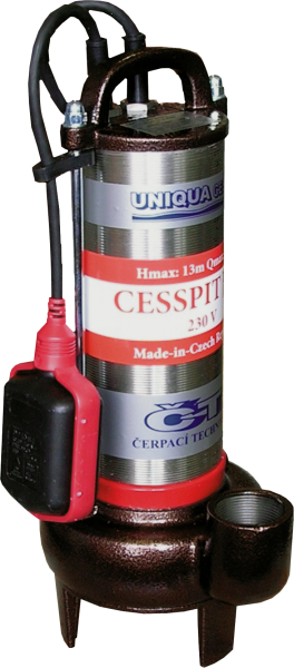 Submersible sludge pump UNIQUA CESSPIT is used for transferring and draining water, sediments and feces. To use the pump for pumping flammable liquid, toxic liquid substance (acid, alkali) is forbidden! To use the pump in a place with a threat of explosion is forbidden too. The producer can make pumps with a different length of cable compliance according to the wish of a costumer. The pumps can by used in vertical, horizontal or tilted position.